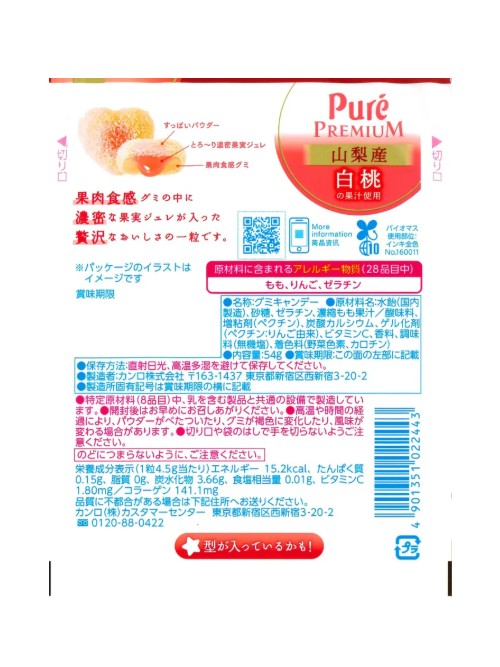 Ingredients: Corn syrup, sugar, gelatin, concentrated peach juice/acidifier, thickner (pectin), calcium carbonate, gelling agent (pectin: derived from apples), vitamin C, color (purple carrot juice, carrot juice, pumpkin extract), seasoning (inorganic salt), flavoring.